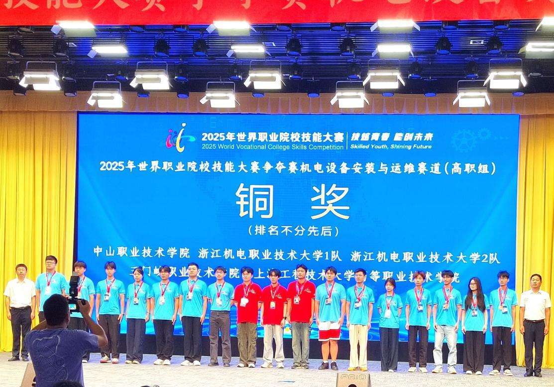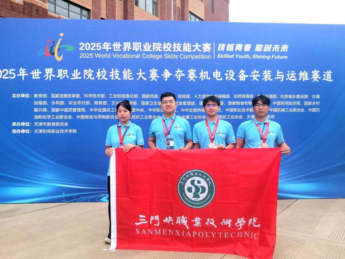 9月18日-22日,2025年世界职业院校技能大赛总决赛争夺赛“机电设备安装与运维”赛道在天津机电职业技术学院落下帷幕。由智能制造学院尤向阳和汽车学院雷楠楠主要指导,2023 级电气自动化技术专业李帅兵、于江坡、杜昊坤和2024级风力发电工程技术专业孙一四位同学组建的“智能光伏并网控制系统安装与运维”参赛团队与来自全国83所高职院校的90支代表队同台竞技,表现卓越,喜获铜奖,实现我校在世界职业院校技能大赛工科赛项的历史性突破。