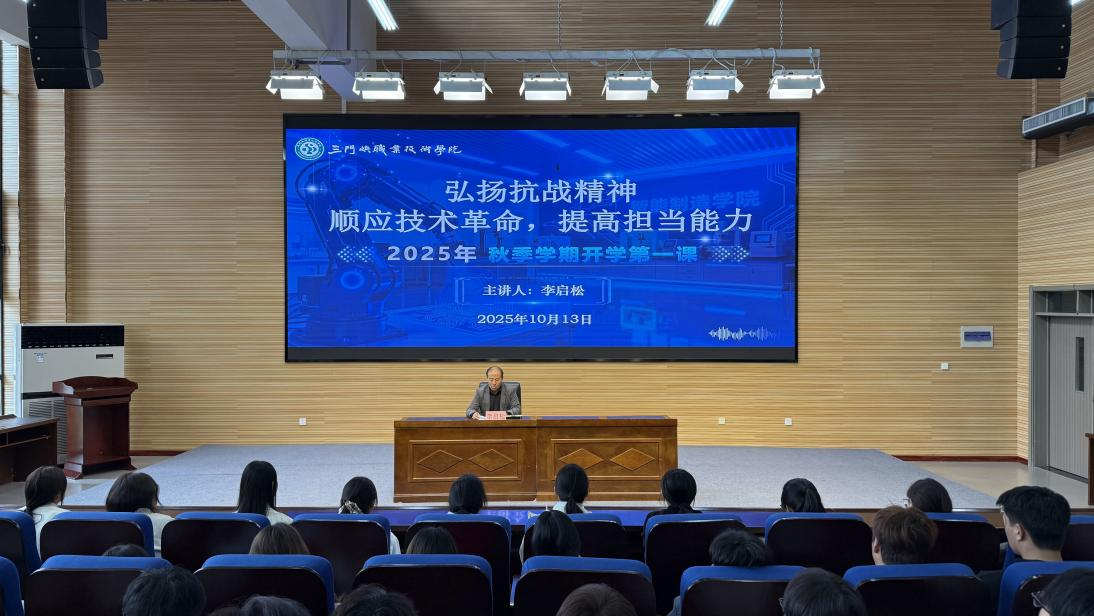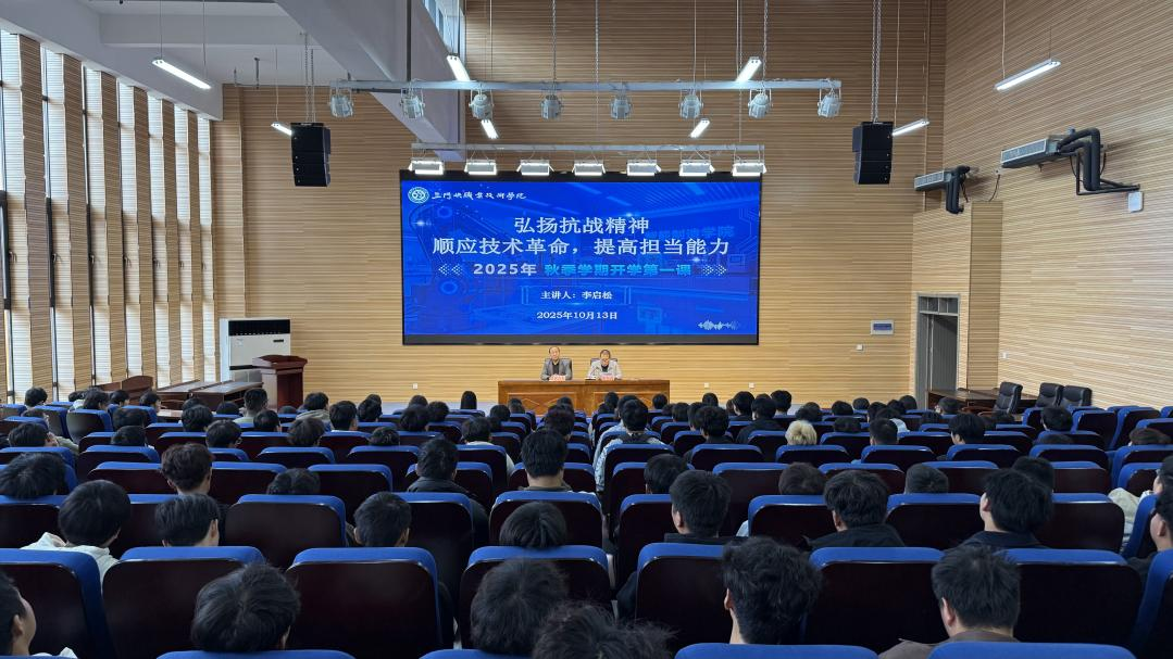 10月13日,院长助理李启松以“弘扬抗战精神,顺应技术革命,提高担当能力”为主题,为智能制造学院2025级新生讲授开学第一课,智能制造学院院长霍海波主持。