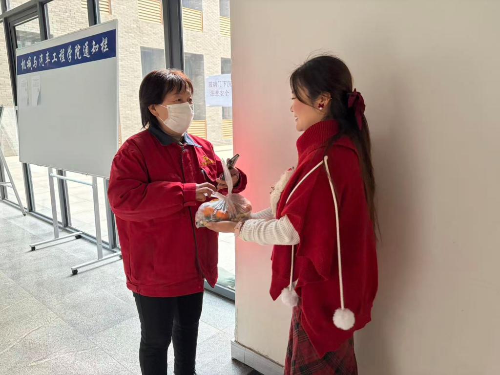 冬至兼具自然与人文双重内涵,除了关怀学生干部,学院更不忘向默默坚守岗位、守护校园平安的后勤值守人员传递温暖。茶话会结束后,学生干部代表们携带准备的零食小吃,分别前往学生宿舍4号、5号、6号楼以及8号教学楼,向坚守在一线的后勤工作人员楼管阿姨致以节日的问候与崇高的敬意。学生干部们与她们亲切交谈致谢,感谢其辛勤付出为同学们营造了良好环境。