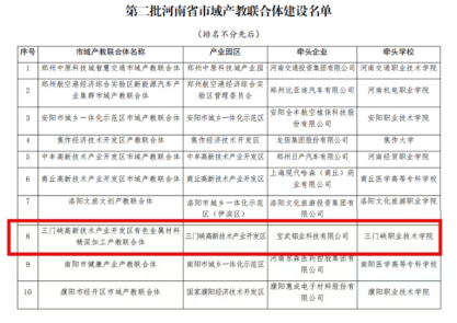 市域产教联合体和行业产教融合共同体是增强职业教育适应性和吸引力的重要举措,是深化产教融合、服务区域经济发展的重要途径,是促进教育链、人才链与产业链、创新链紧密结合的重要载体。我院和三门峡高新技术产业开发区、宝武铝业科技有限公司共同牵头,已聚集开设有色金属材料精深加工类专业的6所高职院校和中职院校,1所普通高校,9个科研机构以及9个学会组织、产业园,10家有色金属加工企业,并将继续联合园区内有色金属精神加工企业、普通高校、职业院校、研究机构、学会等相关单位。